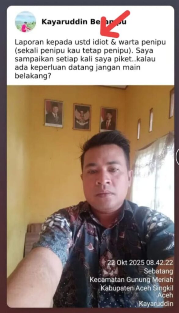 ACEH SINGKIID,MEDIABUSER.CO.ID – Sabtu (25/10/2025) Kepala Dusun (Kadus) 1 Desa Sebatang, Kecamatan Gunung Meriah, Kabupaten Aceh Singkil, Kayarudin, bisa dilaporkan ke aparat penegak hukum setelah diduga menghina tokoh agama dan wartawan penipu penipu melalui unggahan di media sosial Facebook.